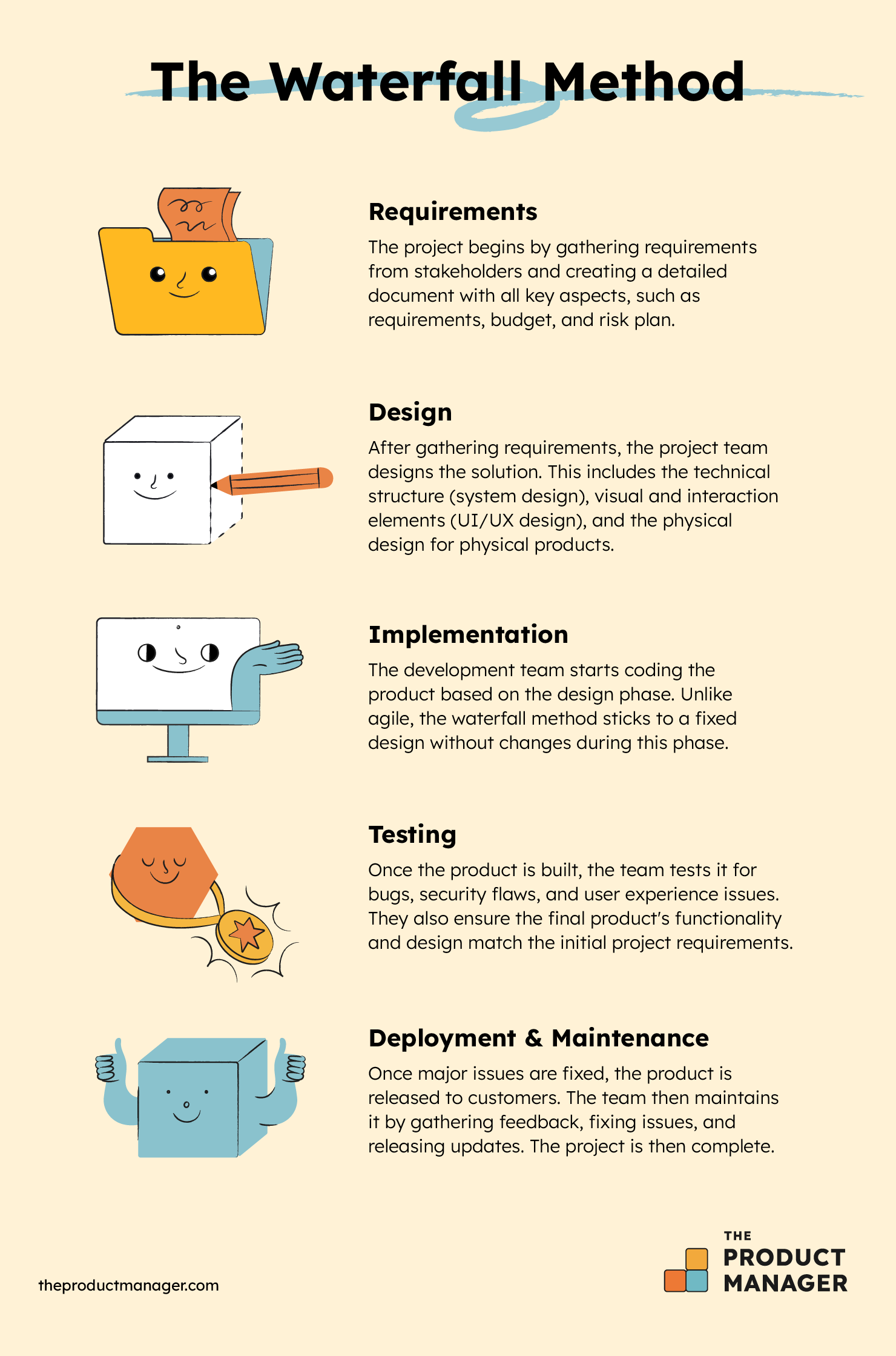 The work flows from one phase to another, then it reaches the bottom and the project is considered “complete”—making it visually similar to a waterfall (hence the term).